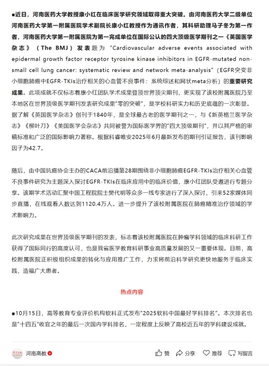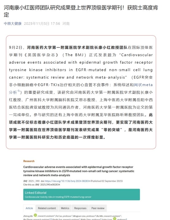 近日,我校第一附属医院学术副院长康小红教授团队在国际顶级医学期刊《英国医学杂志》(The BMJ)正式发表题为“Cardiovascular adverse events associated with epidermal growth factor receptor tyrosine kinase inhibitors in EGFR-mutated non-small cell lung cancer: systematic review and network meta-analysis”(EGFR突变非小细胞肺癌中EGFR-TKIs治疗相关的心血管不良事件:系统综述和网状meta分析)的重要研究成果,该研究由康小红教授、广州医科大学附属脑科医院艾思志教授、上海中医药大学附属岳阳中西医结合医院龚亚斌教授为共同通讯作者,第一附属医院为论文的第一完成单位。参与研究的还有上海中医药大学附属龙华医院陈昕琳教授团队。此项成就不仅标志着康小红团队学术成果登顶世界顶尖期刊,更实现了第一附属医院在世界顶级医学期刊发表研究成果“零的突破”,是其科研实力和历史底蕴的彰显。